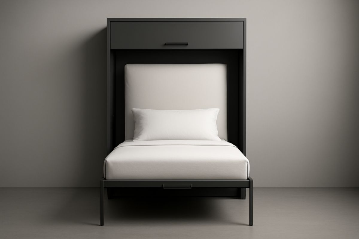 Lit escamotable en métal noir avec matelas en mousse blanc